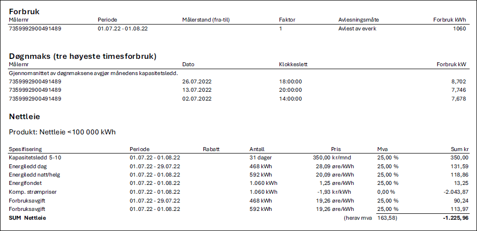 Fra LNETT: -1.225,96 inkludert strømstøtte på kr. 2.043,87